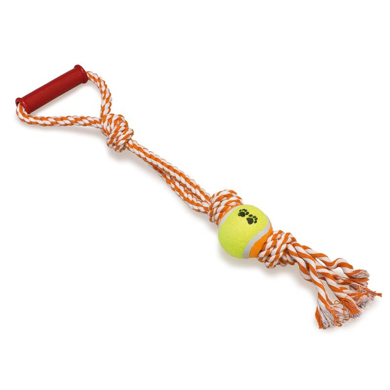 Kolorowy pleciony sznur bawełniany z piłeczką tenisową. Doskonały do zabawy z psem. Wspomaga rozwój zębów psa.